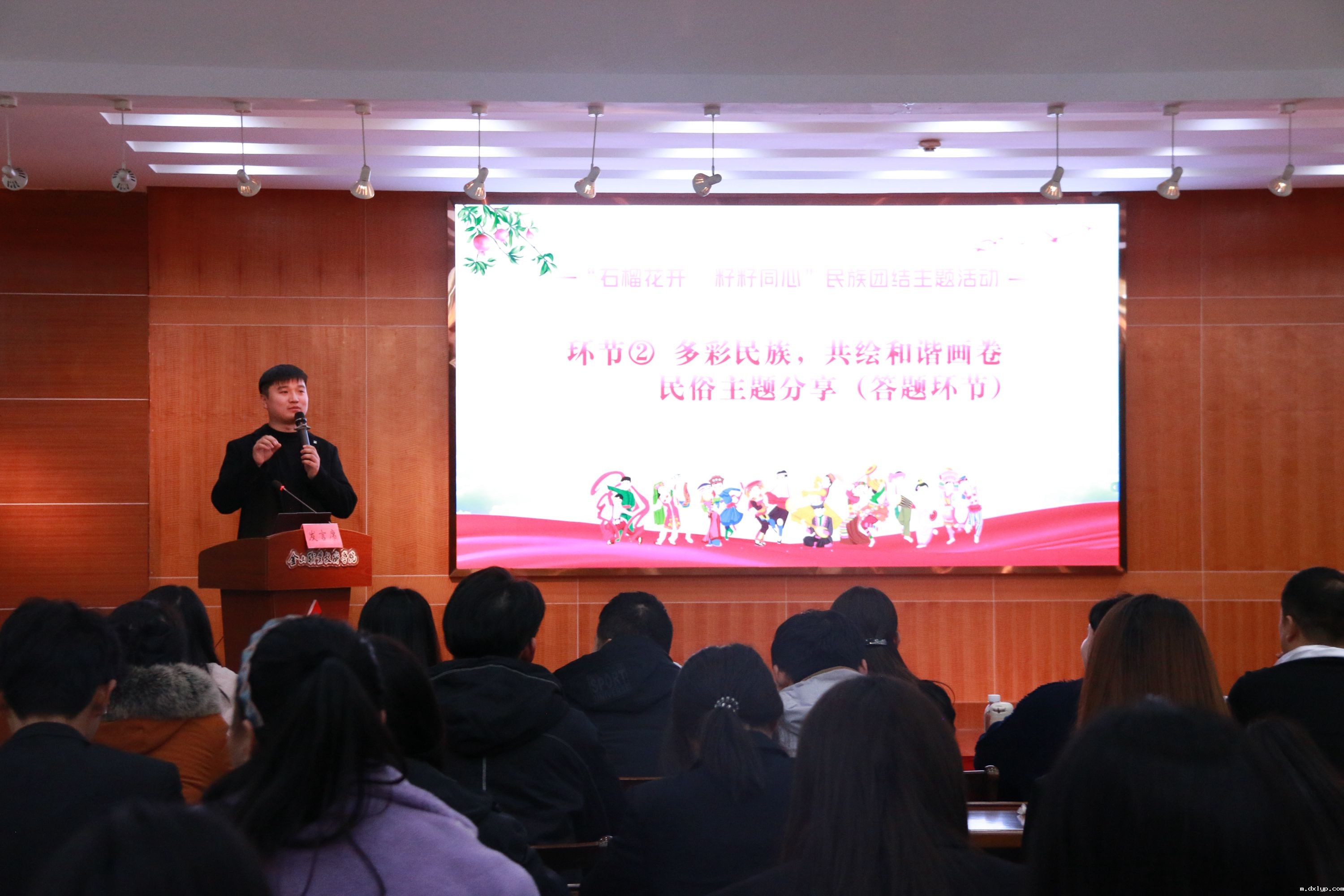 路云洁处长上台致开幕词。她表示,中华民族是一个大家庭,五十六个民族应该像石榴籽一样紧密团结,汉族同学要积极与少数民族同学交流学习,共同促进民族团结和文化繁荣。同时表示学校将进一步健全铸牢中华民族共同体意识教育工作体系,引导广大师生自觉把个人理想追求融入中华民族伟大复兴事业中,做民族团结的“石榴籽”,推动学校铸牢中华民族共同体意识教育有形有感有效,再上新台阶。
